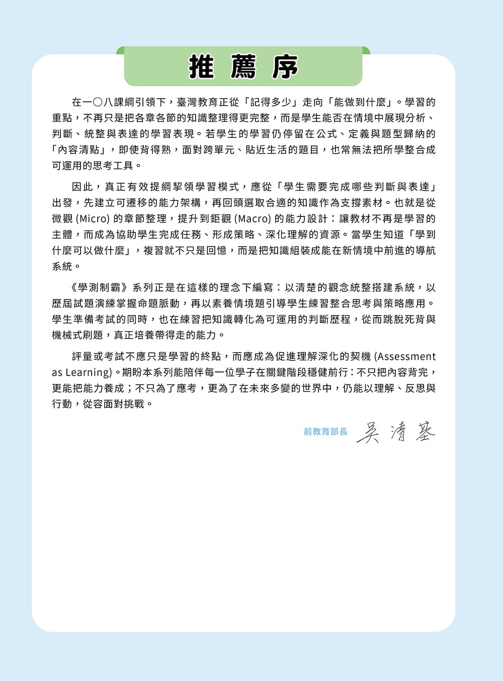 歷屆試題練習多選自108課綱實施後之學測試題,協助學生掌握最新命題趨勢與出題形式,讓學生熟悉各類題型變化,提升臨場應試信心,上考場更從容不迫。