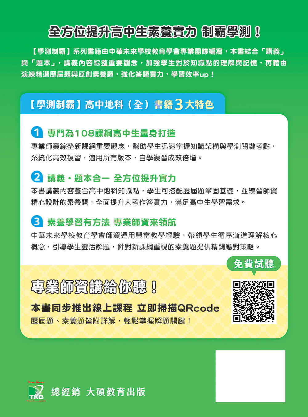 本系列書籍未來將搭配影音線上課程,特別召集擁有多年教學經驗的教師錄製線上影音課程,精析課綱知識重點、傳授學測解題技巧,用最短的時間高效掌握大考核心。