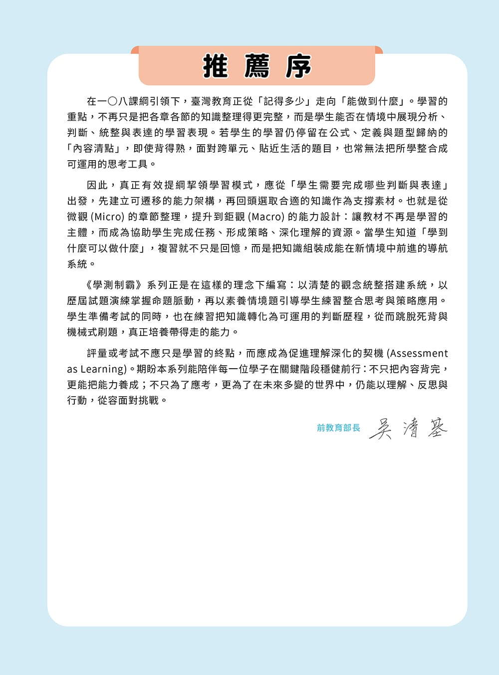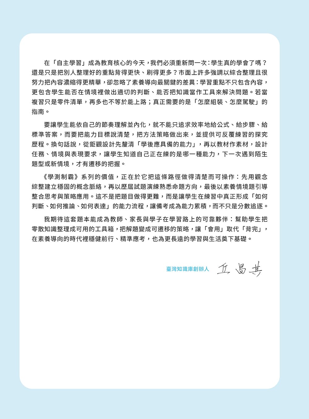 精選近三年學測歷屆試題作為練習素材。近年學測命題趨勢以素養導向為主軸,本書選題特別著重情境整合與跨概念應用,讓學生在熟悉大考題型的同時,也能掌握最新命題方向與關鍵重點。