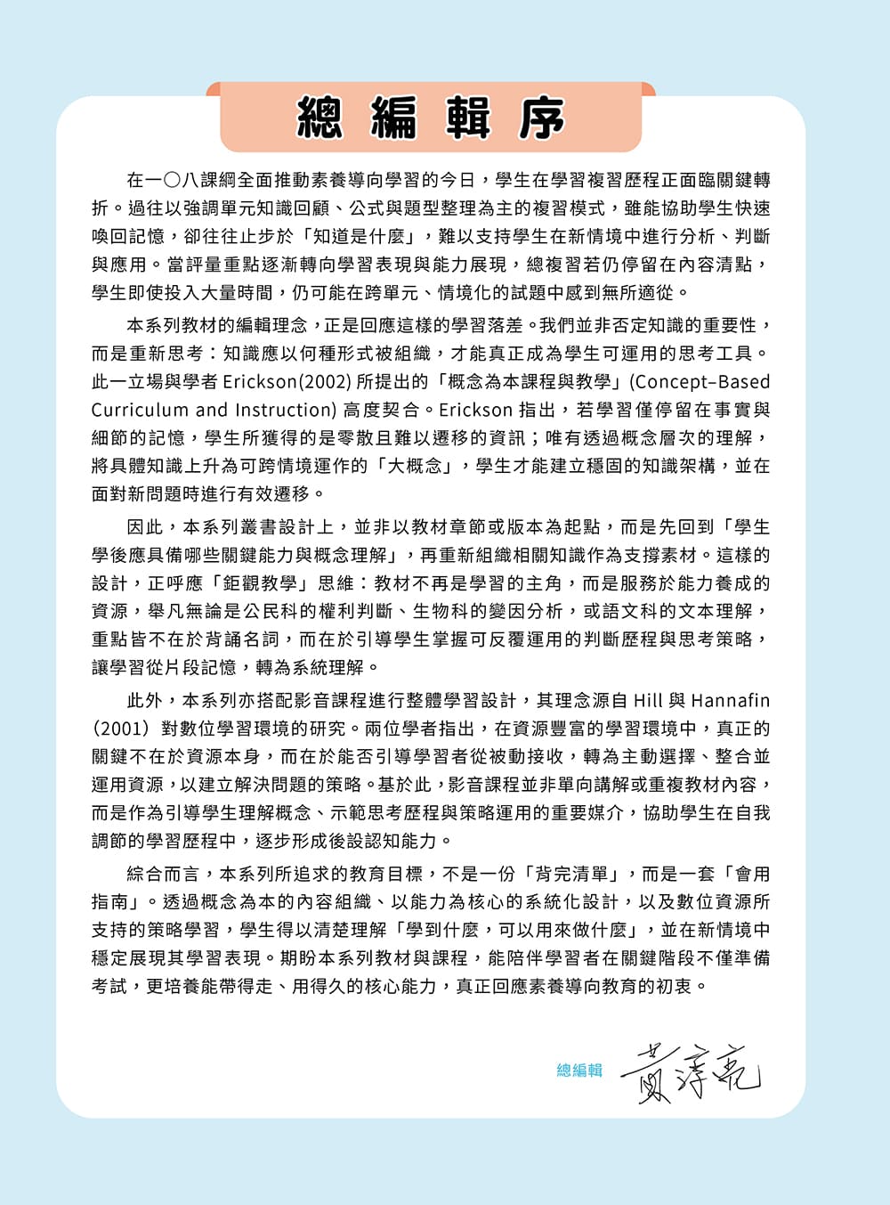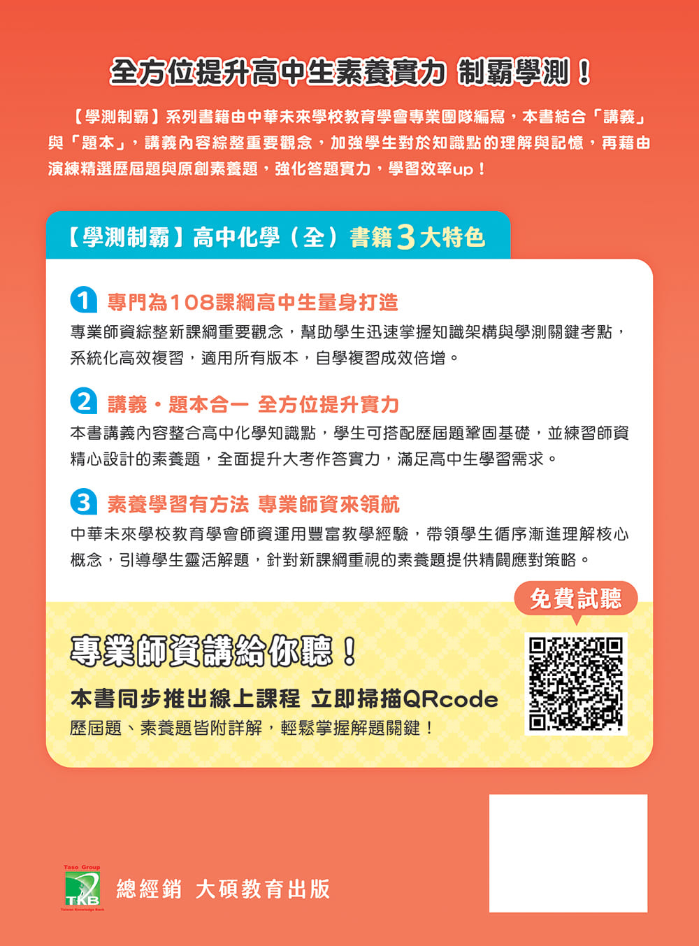 本系列書籍未來將搭配影音線上課程,特別召集擁有多年教學經驗的教師錄製線上影音課程,精析課綱知識重點、傳授學測解題技巧,用最短的時間高效掌握大考核心。