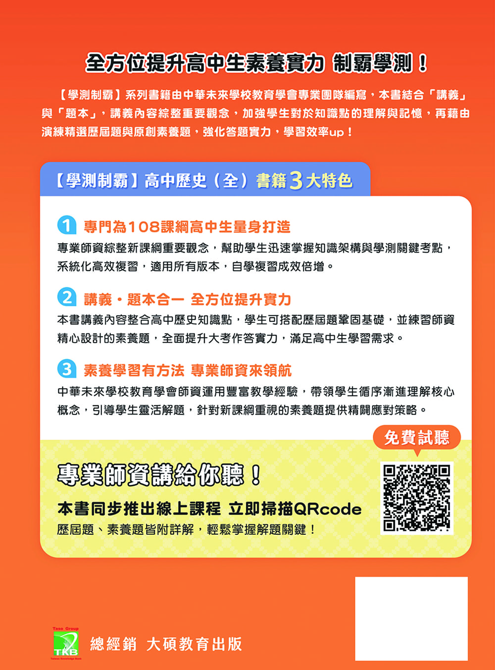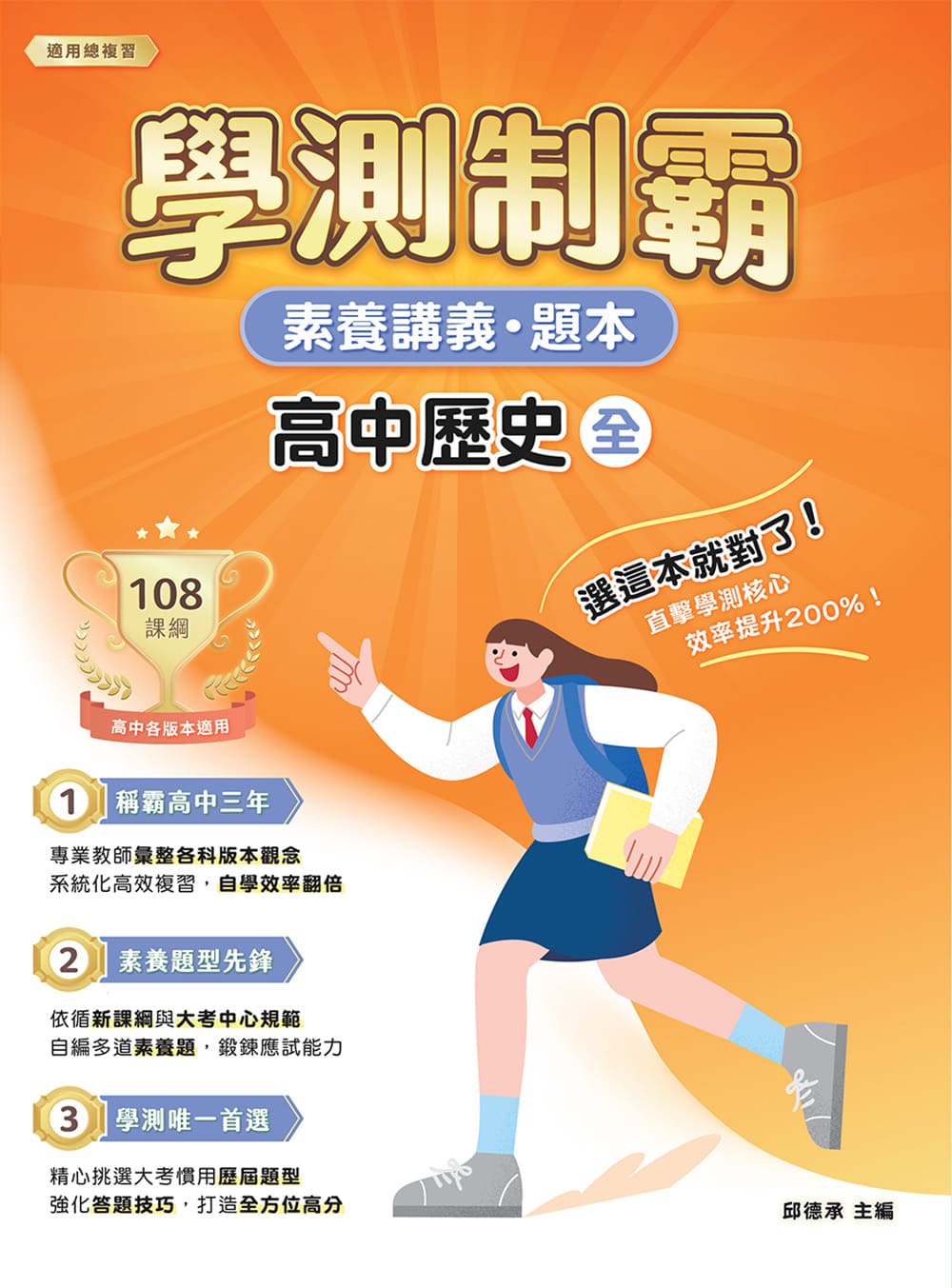 以108課綱內容作為主軸,講述高中歷史的基本架構與脈絡,並以素養為主軸選題,使學生能輕鬆快速掌握高中歷史知識。