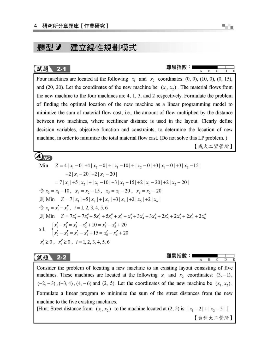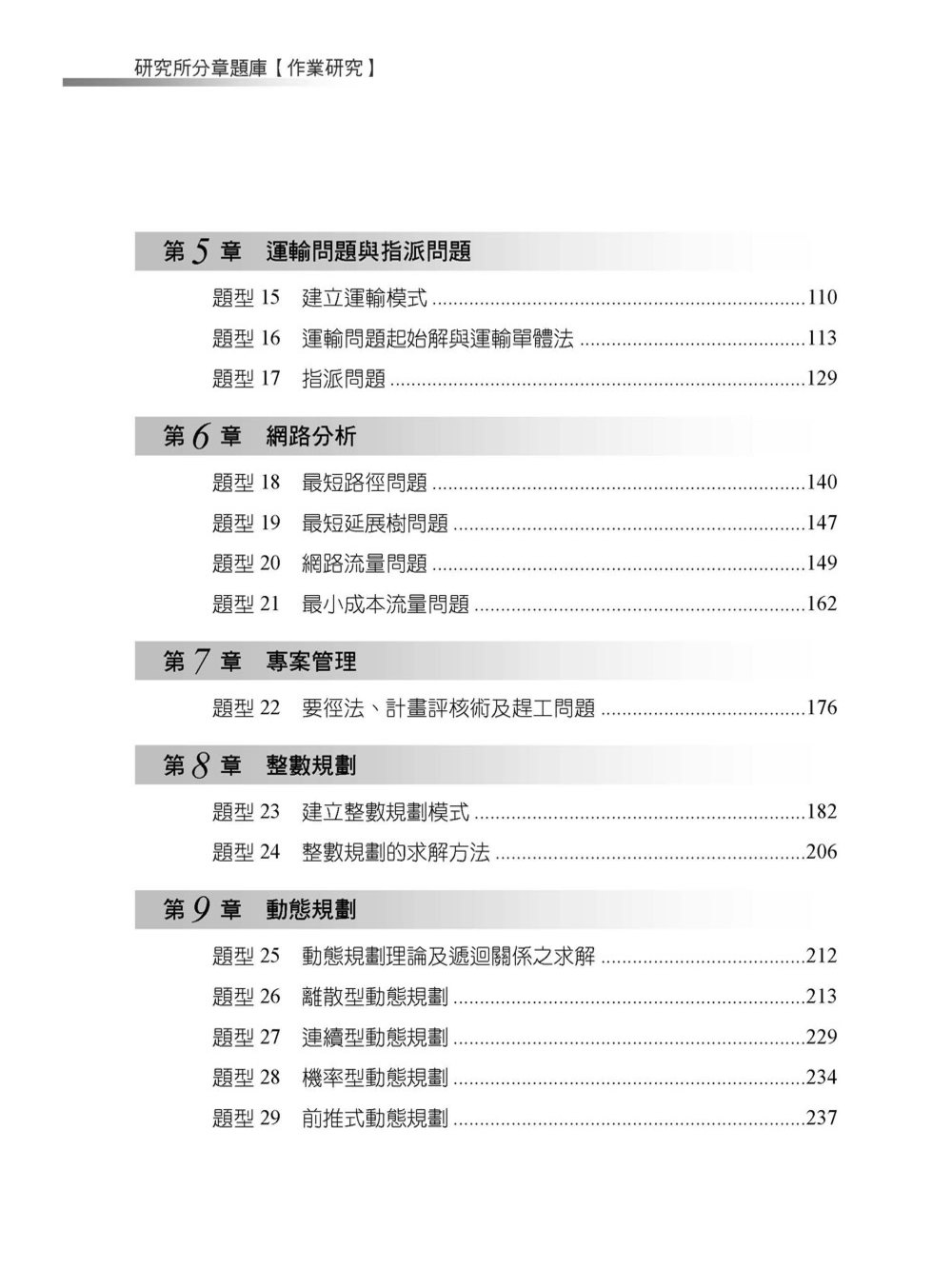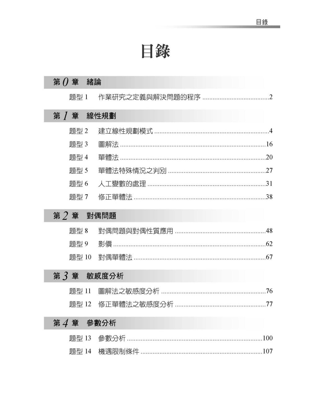 一、以分章節搭配題型的方式針對作業研究的考題進行詳解,解法方面務求詳盡,使考生易讀易懂。