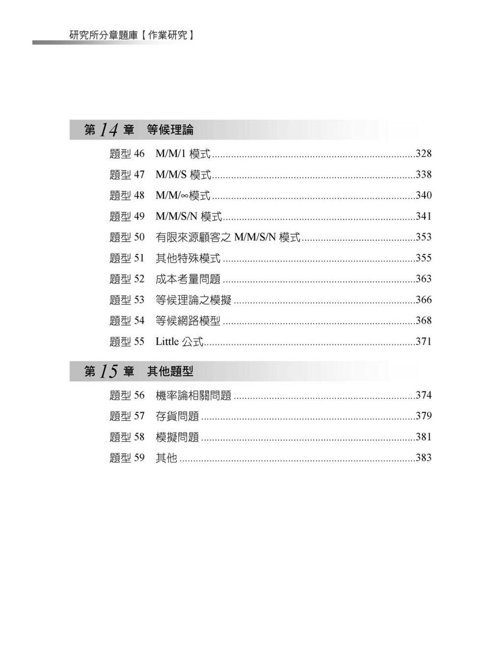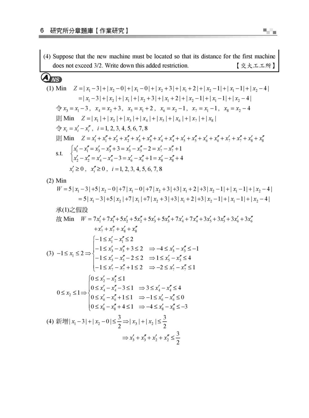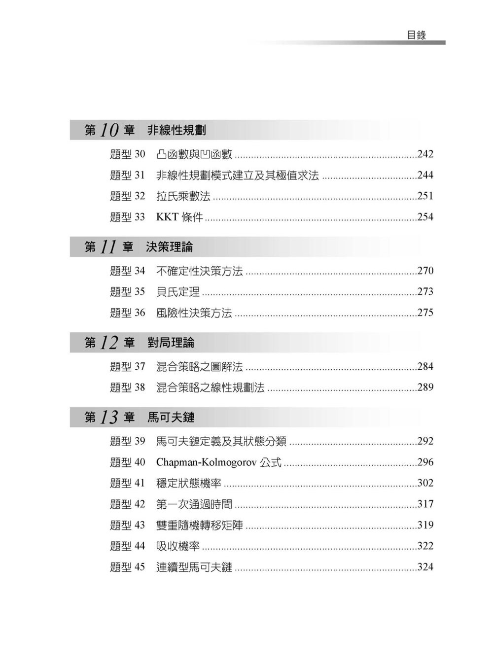一、以分章節搭配題型的方式針對作業研究的考題進行詳解,解法方面務求詳盡,使考生易讀易懂。