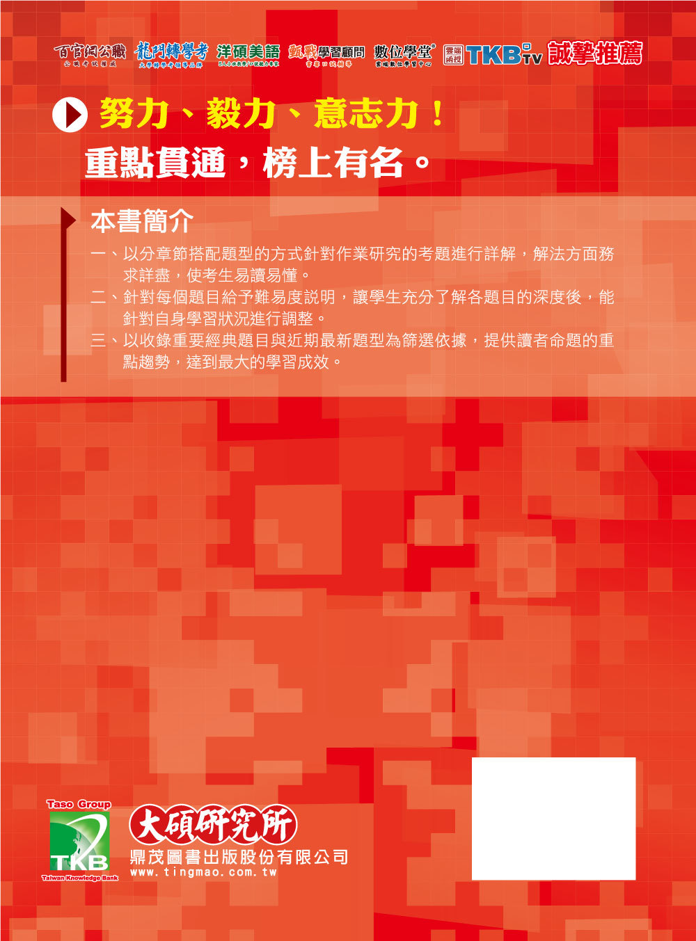 三、以收錄重要經典題目以及近期最新題型為篩選依據,提供讀者命題的重點趨勢,達到最大的學習成效。