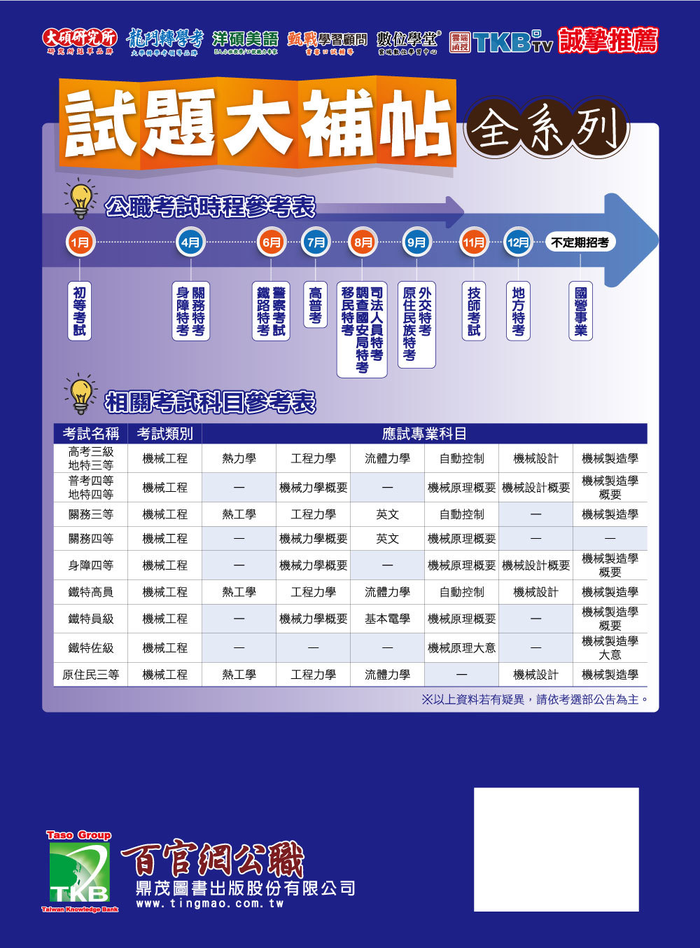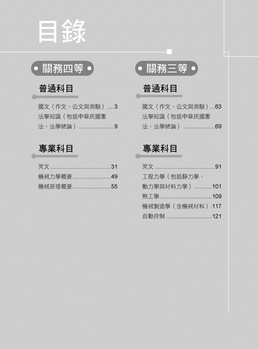 專業科目:英文、機械力學概要、機械原理概要、工程力學(包括靜力學、動力學與材料力學)、熱工學、機械製造學(含機械材料)、自動控制